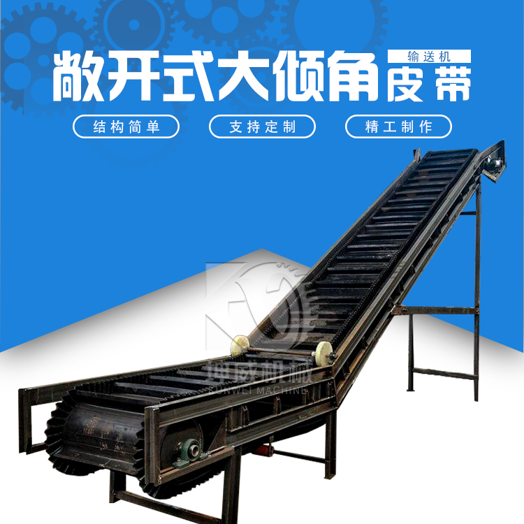 1、大傾角輸送機(jī)的輸送帶采用波形擋邊和橫隔板,有效地減少了物料輸送過程中散落的問題,大幅度提高了物料輸送效率。